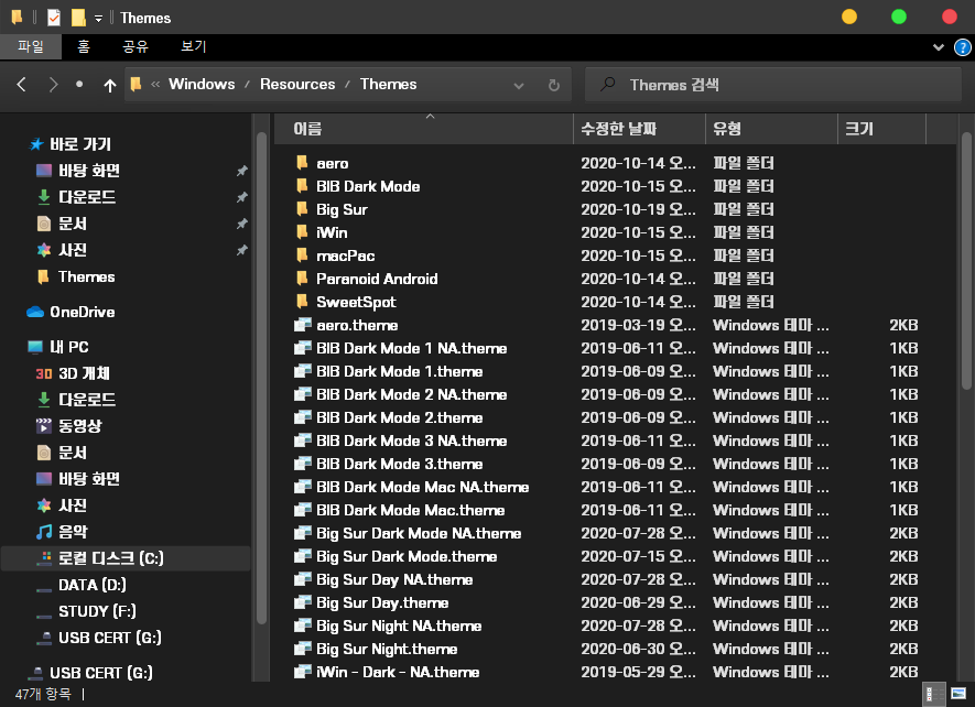위 파일들(9개) 을 C:\Windows\Resources\Themes 경로에 자르거나 복사하여 붙여넣는다.