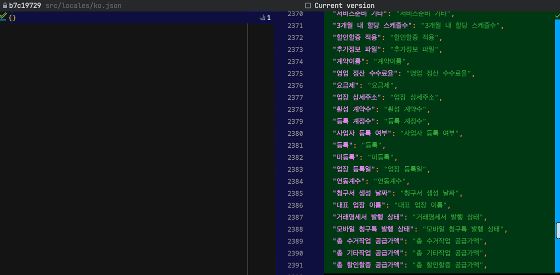이렇게 1차적으로 스크립트 테스트를 했지만 이후 시간을 들여 수작업으로 영문키로 전환하기로 했기에, 추출된 ko.json은 드랍했다.